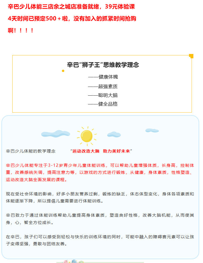 众所周知,现在很多家长选择体育培训,最基本的需求是:想让孩子体质好,少生病;想让孩子有乐观自信的品质,想通过体育培养孩子勇于尝试,愈挫愈勇的精神等。所以少儿体能是孩子的最佳选择。
